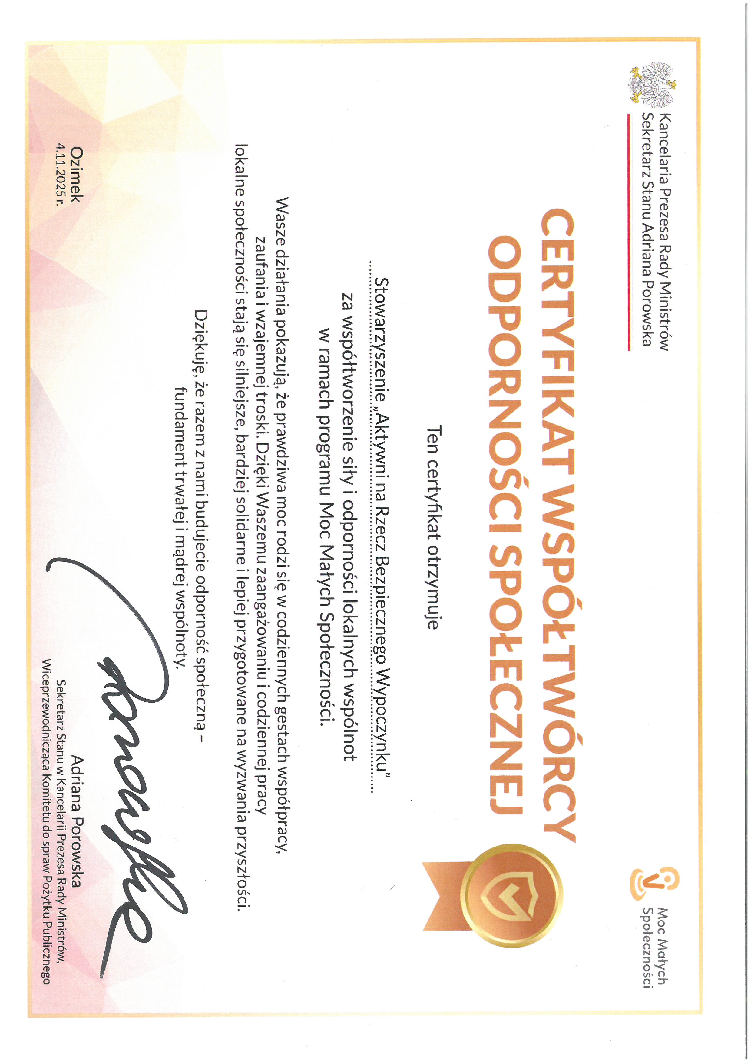 Certyfikat Odporności Społecznej i podziękowania